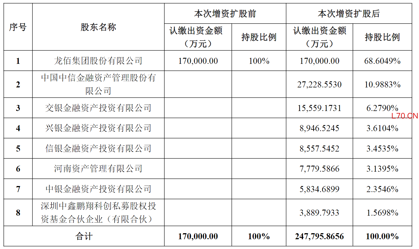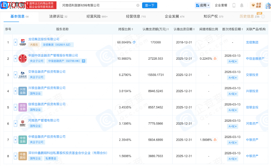 据佰利联新材料母公司龙佰集团(002601)公开公告及企查查工商数据显示,此次佰利联新材料通过增资扩股引入7家战略投资者,合计募资规模达20亿元,四大银行系AIC悉数入局且出资力度各有侧重。