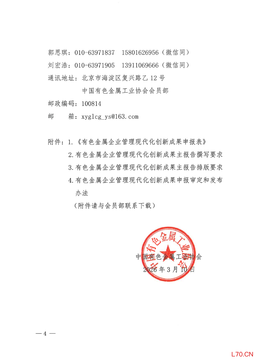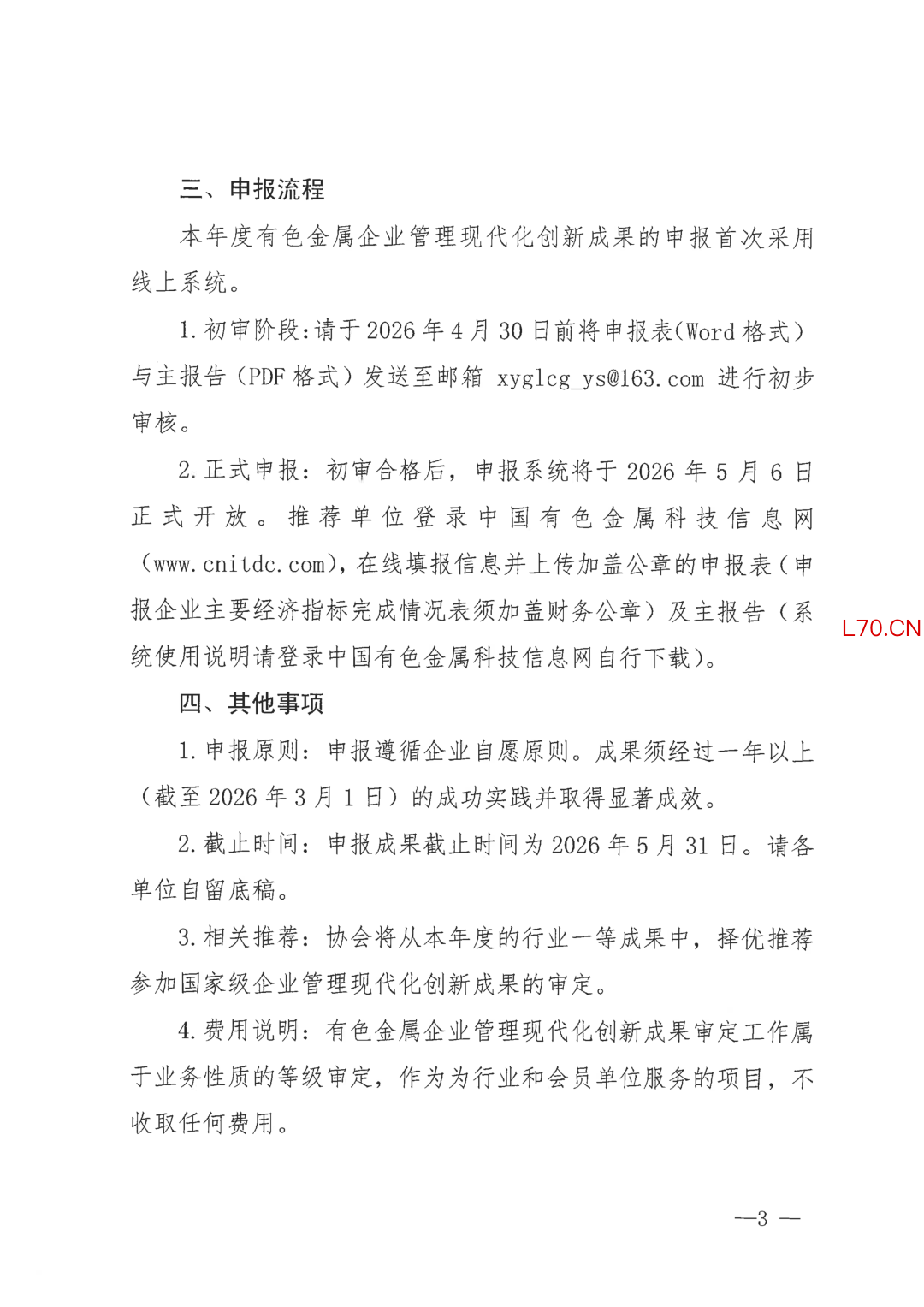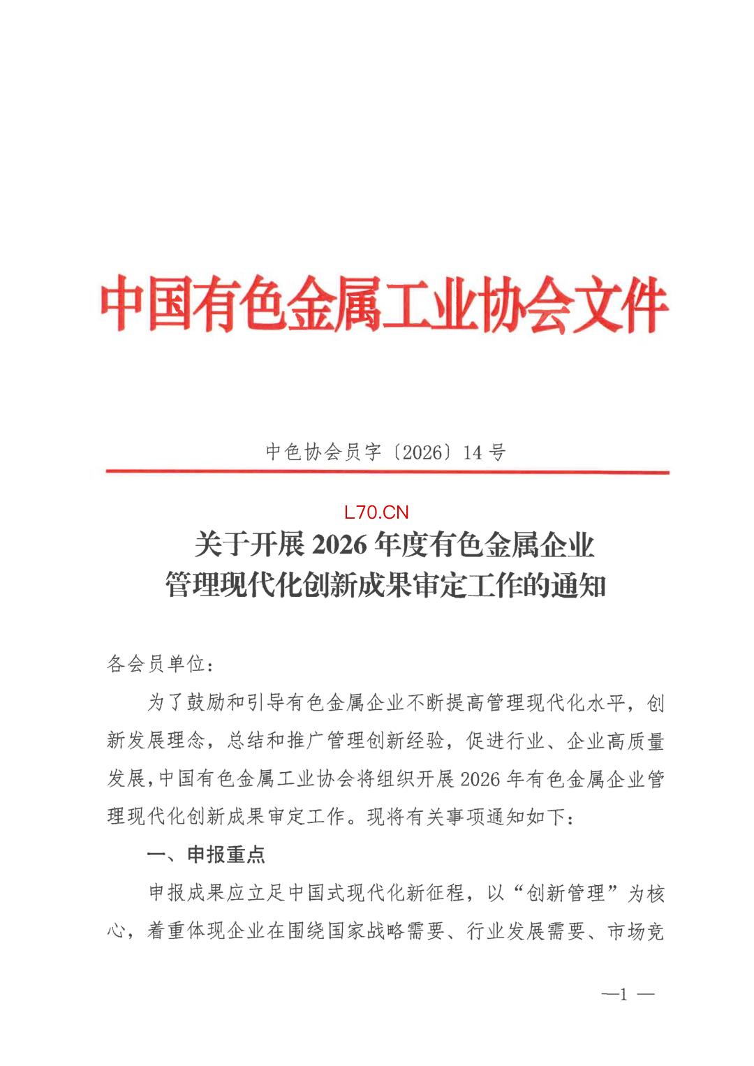 为了鼓励和引导有色金属企业不断提高管理现代化水平,创新发展理念,总结和推广管理创新经验,促进行业、企业高质量发展,中国有色金属工业协会将组织开展2026年有色金属企业管理现代化创新成果审定工作。现将有关事项通知如下: