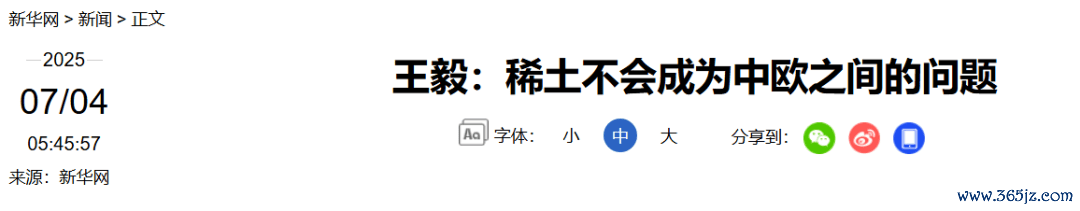 针对记者问及欧洲企业关注中方稀土实施出口管制问题,王毅表示,对军民两用物项实施必要管制是各国行使主权,也是应尽国际义务。中方的政策符合国际惯例,也有利于维护世界和平稳定。稀土出口从来不是、也不应成为中欧之间的问题。只要遵守出口管制规定并履行必要程序,欧洲企业的正常需求将得到保障。中方主管部门还为欧洲企业设立了“快速通道”,有人故意在中欧之间炒作此事是别有用心。