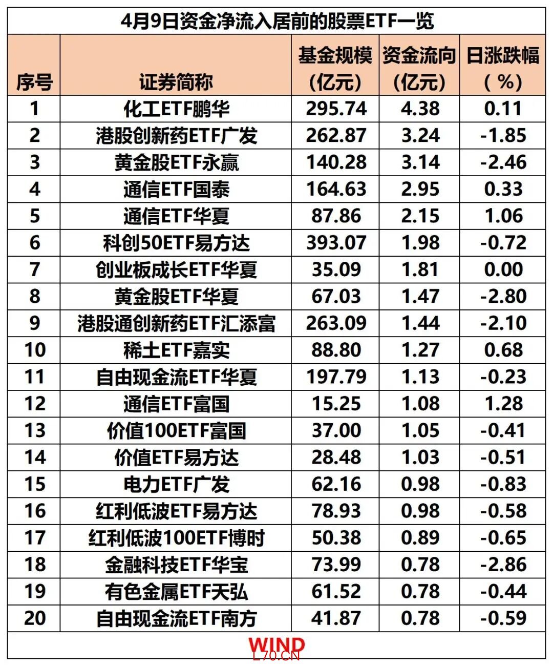 从资金净流入看,4月9日,化工、创新药、黄金、通信等热门主题ETF成为“吸金”大户,科创50ETF、创业板成长ETF等宽基ETF资金净流入居前。