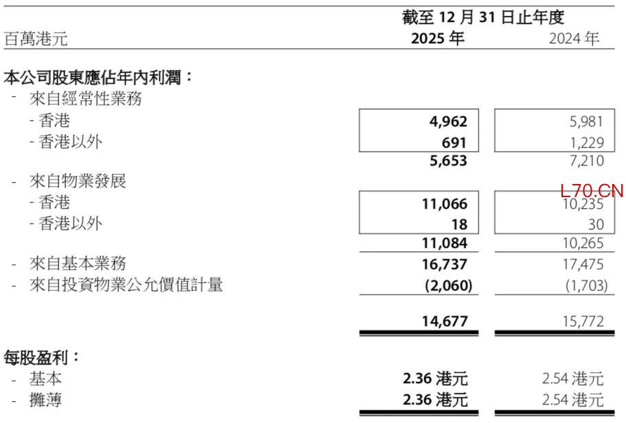 经常性业务利润为56.53亿港元,较2024年的72.10亿港元下降21.6%。物业发展利润为110.84亿港元,较2024年的102.65亿港元增长8.0%。