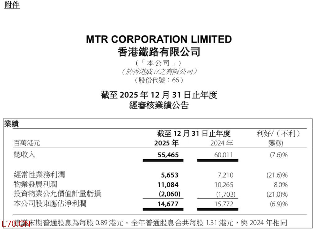 净利润下降 香港车务营运部分亏损扩大