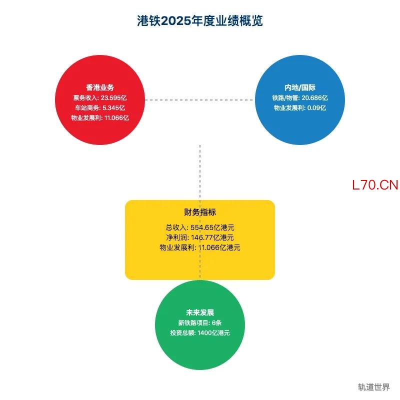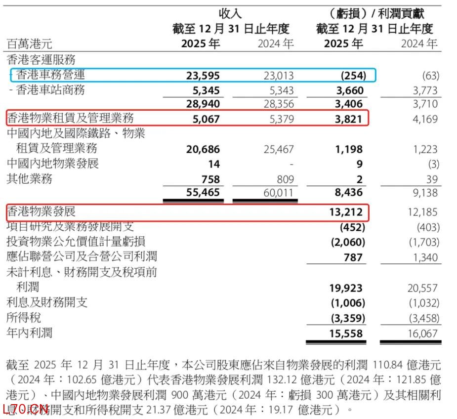 收入方面,2025年总收入为554.65亿港元,较2024年的600.11亿港元下降7.6%。其中,香港车务营运收入235.95亿港元,同比增长2.5%;香港车站商务收入53.45亿港元,与2024年基本持平;香港物业租赁及管理业务收入50.67亿港元,同比下降5.8%;中国内地及国际铁路、物业租赁及管理附属公司收入206.86亿港元,同比下降18.8%。